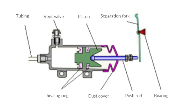 As the actuating terminal of the hydraulic clutch system, it converts hydraulic pressure transmitted from the master cylinder into mechanical thrust. This force either drives the release fork or directly pushes the release bearing, thereby engaging and disengaging the clutch pressure plate.